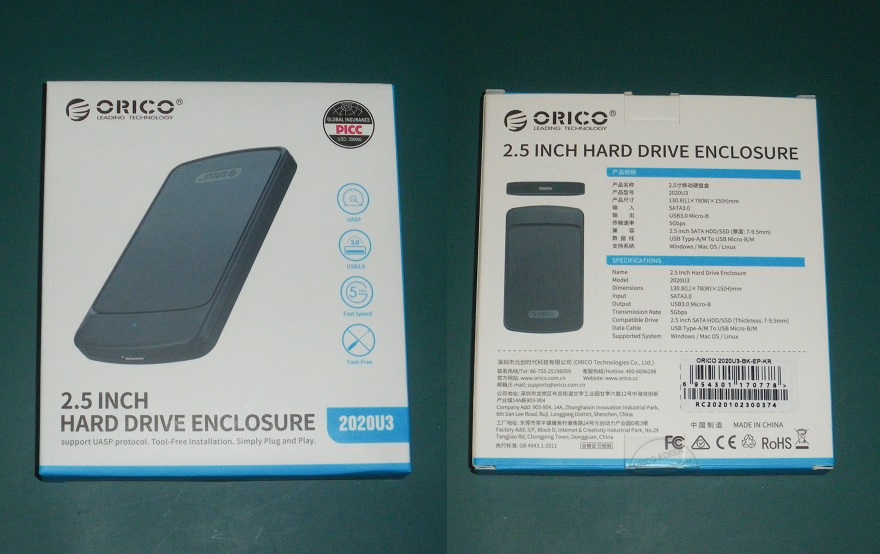 ORICO 2020U3는 2.5인치 형의 HDD, SSD를 지원하는 외장 케이스로 높이 7mm와 9.5mm를 사용할 수 있습니다.