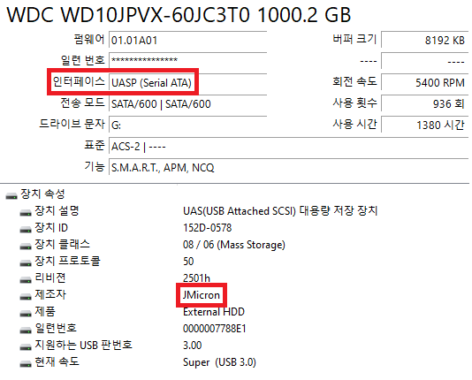 외장 케이스의 컨트롤러로 JMicron 제품이 사용된 것으로 보입니다.