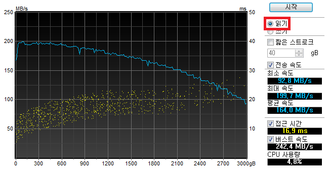 평균 속도가 164MB/s로 측정이 되었습니다.