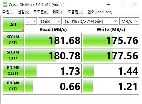 순차 읽기 약 180MB/s, 순차 쓰기 약 175MB/s의 결과를 보여 줬습니다.