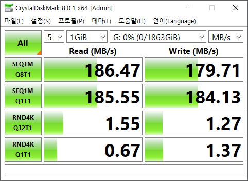 순차 읽기 속도 약 185MB/s, 순차 쓰기 속도 약 184MB/s로 측정이 되었습니다.