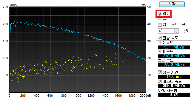 평균 속도가 165.9MB/s로 측정되었습니다.