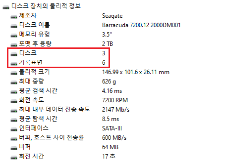 플래터가 3장 사용됐다고 표시되어 있는데 Aida64는 제품 모델명으로 DB에 있는 정보를 보여주는 것이기 때문에 실제 플래터의 숫자를 체크하지는 못하고 ST2000DM001의 경우 무조건 3디스크로 표시를 합니다.