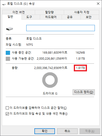 표기 용량은 2TB이지만 실제 사용 가능한 용량은 약 1.81TB입니다.