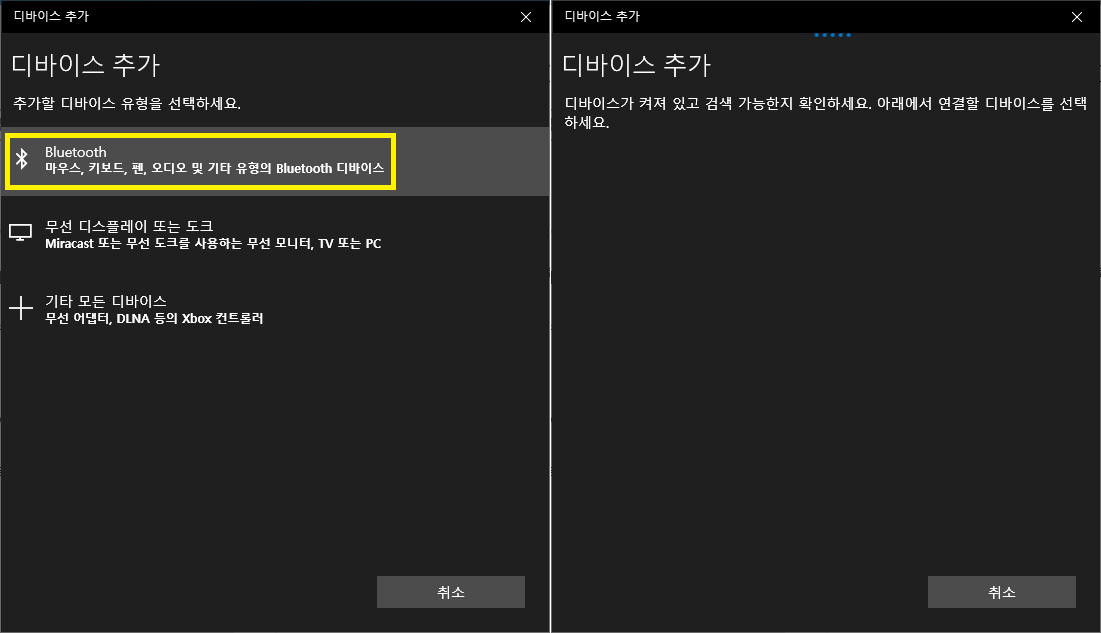 실제 장치 연결을 해보려고 했는데 주변의 블루투스 장치를 인식하지 못하고 무한 검색 상태가 되었습니다.