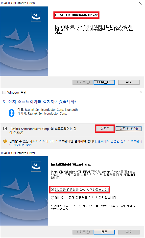 제공받은 CD 안에 있는 REALTEK Bluetooth 드라이버를 설치해 줬습니다.