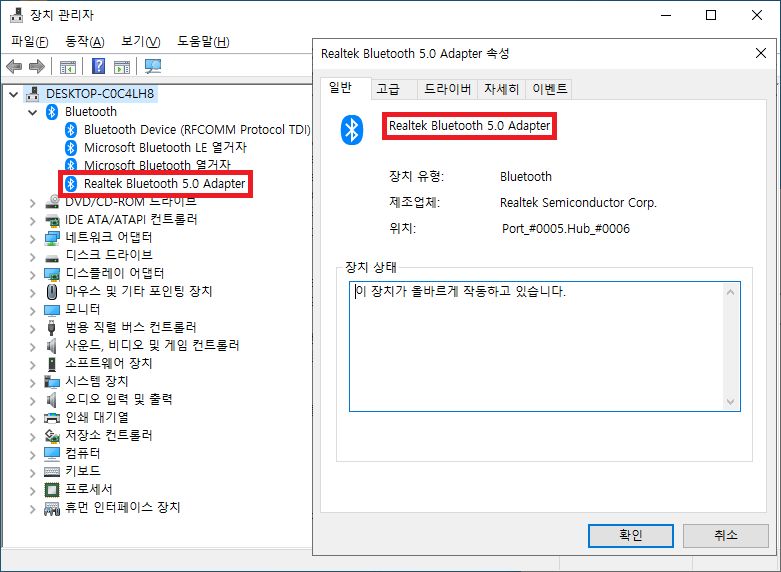 Generic Bluetooth Adapter에서 'Realtek Bluetooth 5.0 Adapter'로 변경된 것을 확인할 수 있습니다.