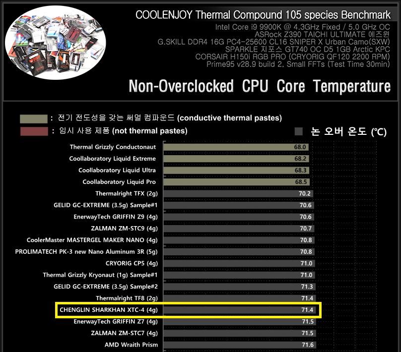 2019년에 쿨엔조이에서 써멀 컴파운드 105종을 비교 테스트한 결과 중 발췌한 스샷입니다.