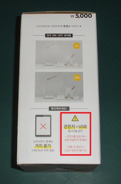 박스 측면에 건전지와 USB 동시 사용을 금지한다는 경고가 붙어 있습니다.