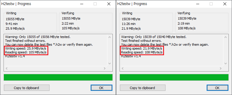 H2testw 결과입니다.