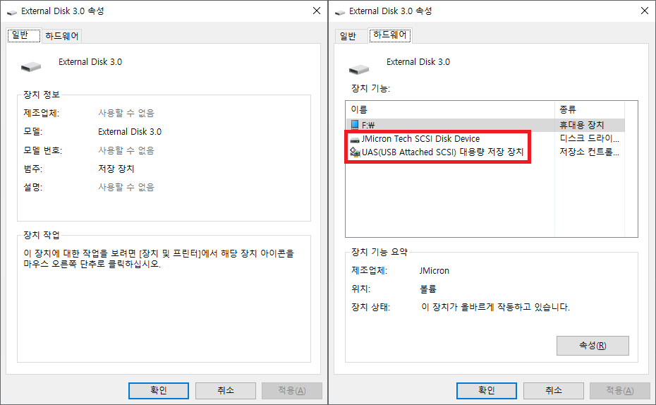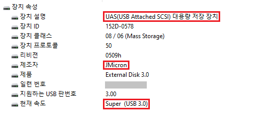 여기서도 JMicron 컨트롤러를 사용했고 UASP를 지원함을 확인할 수 있었습니다.