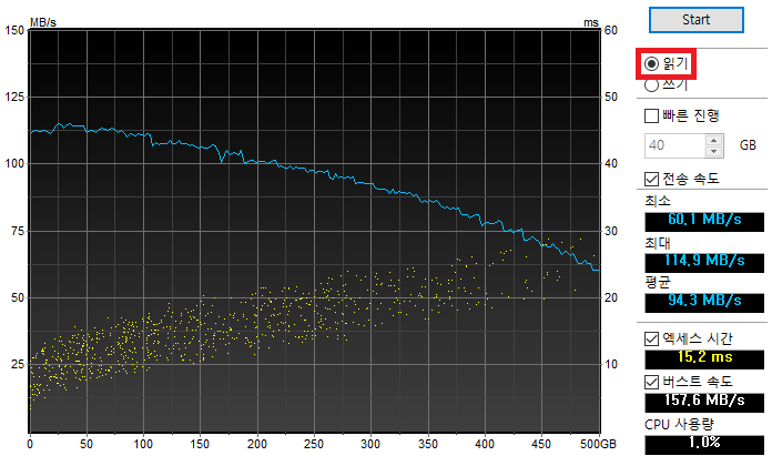 평균 읽기 속도가 94.3MB/s로 측정되었습니다.