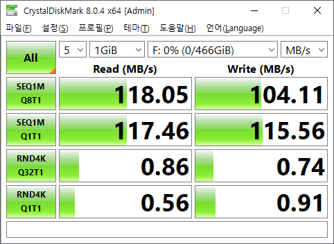 읽기 약 117MB/s, 쓰기 약 115MB/s로 측정되었습니다.