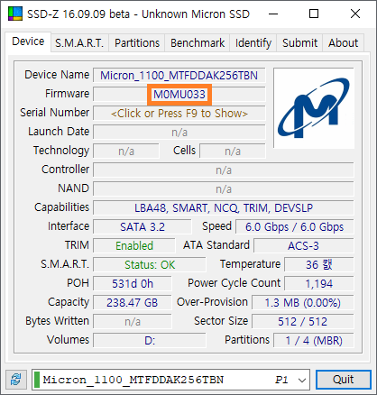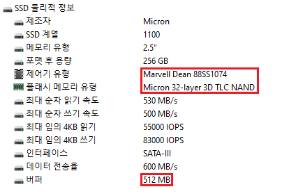Aida64에서 확인한 Micron 1100의 물리적 정보입니다.