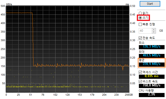 쓰기 벤치 그래프를 보면 시작은 460MB/s 정도의 속도를 보여주다가 20% 정도를 지나는 지점부터 급감돼서 150MB/s의 속도를 유지하는 결과를 보여줬습니다.