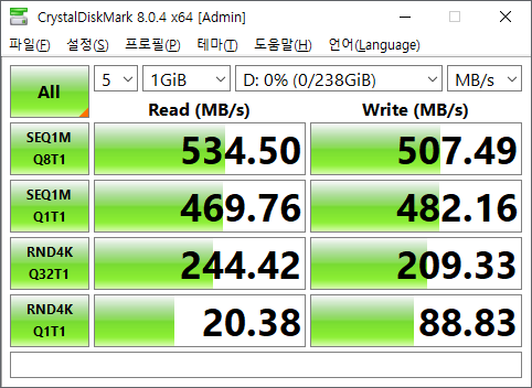 읽기 약 505MB/s, 쓰기 약 482MB/s로 측정되었습니다.