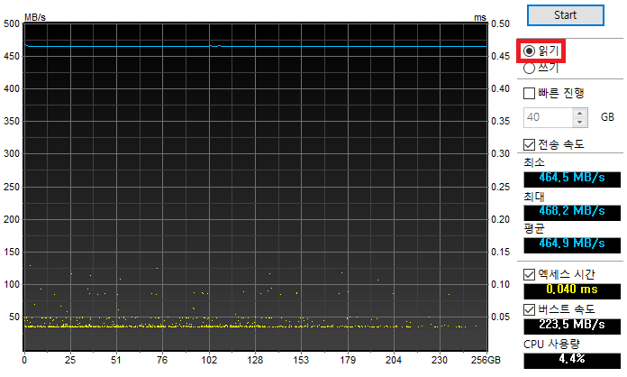 평균 읽기 속도가 464.9MB/s로 측정되었습니다.