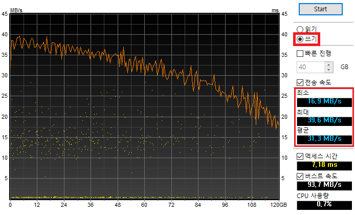 평균 쓰기 속도가 31.3MB/s로 측정되었습니다.