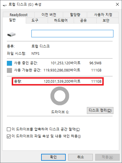표기 용량은 120GB 지만 실사용 가능 용량은 약 111GB입니다.