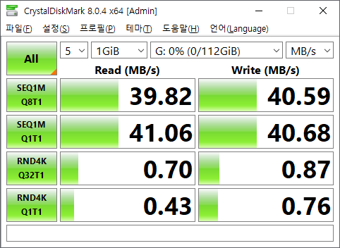 읽기 약 40MB/s, 쓰기 약 40MB/s로 측정되었습니다.