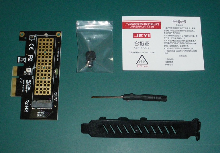 어댑터 본체, + 드라이버, PCI 브라켓, 나사, JEYI 보증서로 구성되어 있습니다.