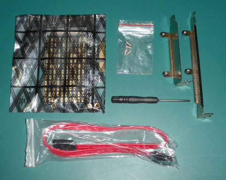 어댑터 본체, 일반용 브라켓, LP용 브라켓, + 드라이버, 나사, SATA 케이블로 구성되어 있습니다.