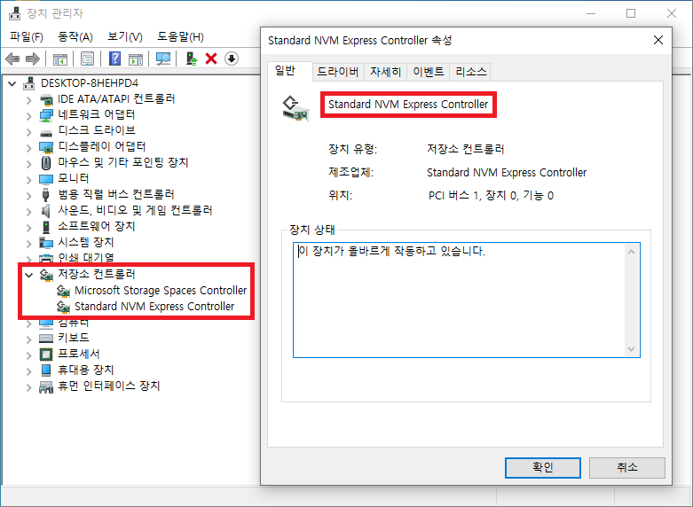 'Standard NVM Express Controller' 저장소 컨트롤러가 설치되어 제어됩니다.