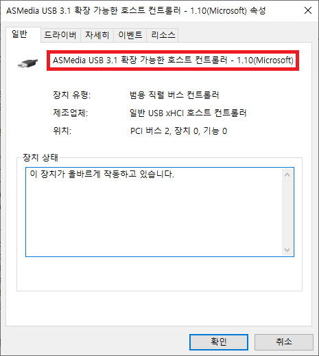 'ASMedia USB 3.1 확장 가능한 호스트 컨트롤러 - 1.10(Microsoft)'로 인식되었습니다.