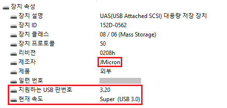 JMicron 칩셋을 사용했음을 알 수 있습니다.