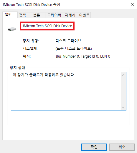 'JMicron Tech SCSI Disk Device'로 인식되었습니다.