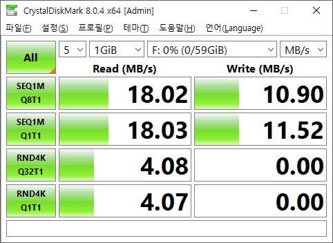 읽기 약 18MB/s, 쓰기 약 11MB/s로 측정되었습니다.