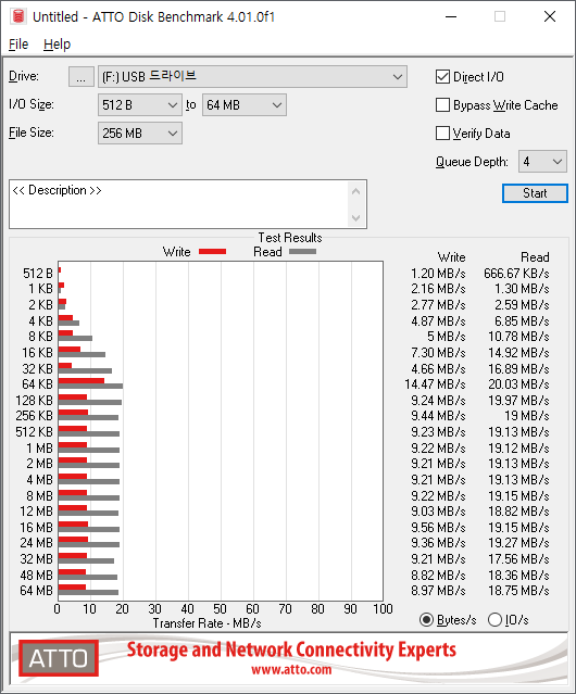 읽기 약 19MB/s, 쓰기 약 9MB/s로 측정되었습니다.