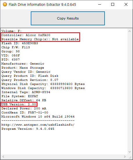 컨트롤러가 Alcor 0xFA00으로 표시되었고 사용한 낸드 종류는 확인할 수 없었습니다.