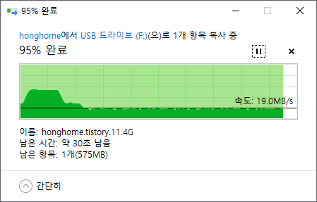 쓰기 속도 테스트를 위해 실제 USB 메모리로 파일을 복사해 봤습니다.