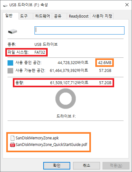 FAT32 파티션으로 포맷되어 있고 자동 백업 애플리케이션인 Sandisk Memory Zone가 들어 있어서 42.6MB의 용량이 사용 중으로 나옵니다.