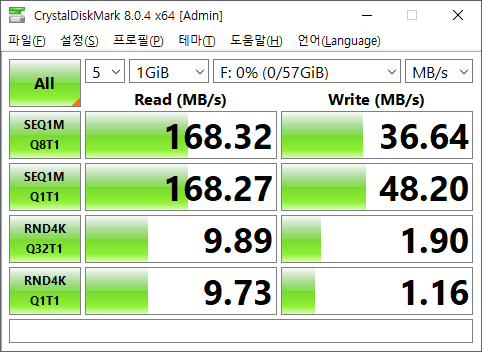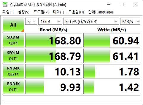 순차 읽기 약 168MB/s, 순차 쓰기 약 60MB/s로 측정되었습니다.