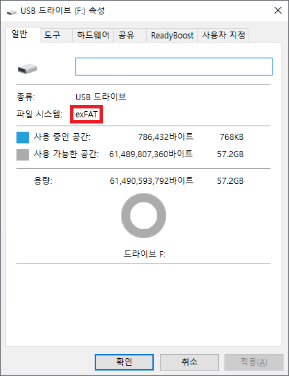 실제 사용 가능한 용량은 약 57.2GB입니다.