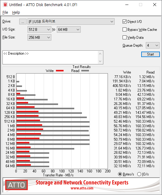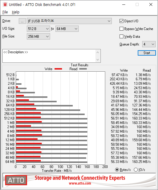 읽기 약 160MB/s, 쓰기 약 56MB/s로 측정되었습니다.