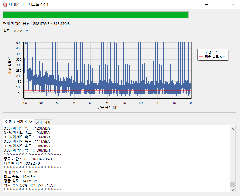 평균 속도가 141MB/s 측정되었고 평균 속도 50% 미만 구간이 1.7%로 결과가 나왔습니다.