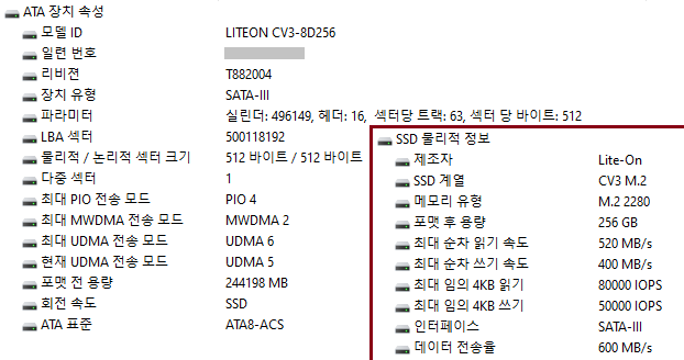 D램은 SK하이닉스 DDR3L 512MB가 사용되었고 TBW는 160TBW입니다.