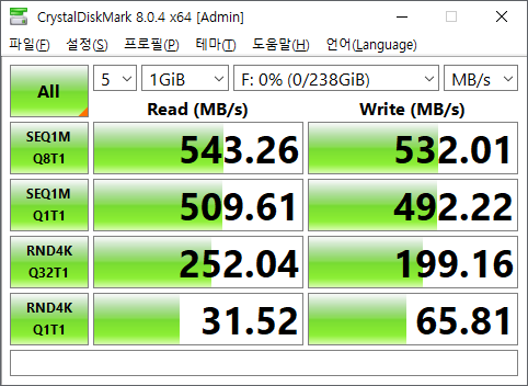 읽기 속도 약 540MB/s, 쓰기 속도 약 530MB/s로 측정되었습니다.