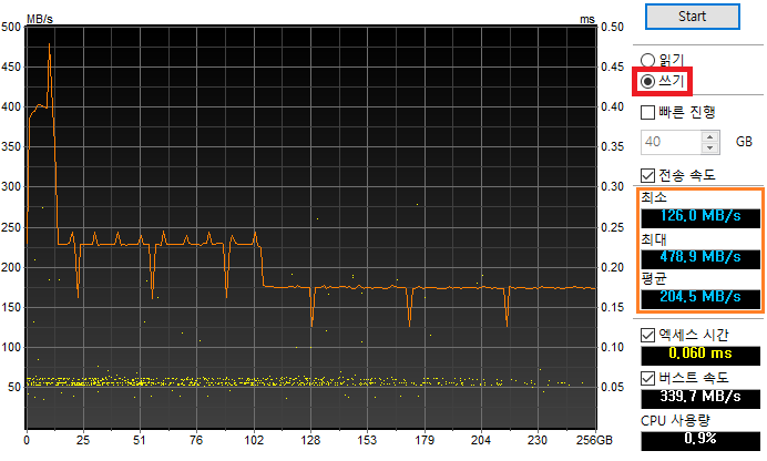 평균 쓰기 속도가 204.5MB/s로 측정되었습니다.