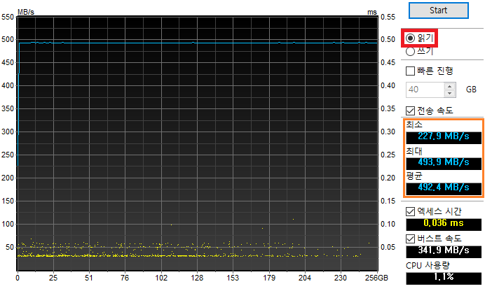 평균 읽기 속도가 492.4MB/s로 측정되었습니다.