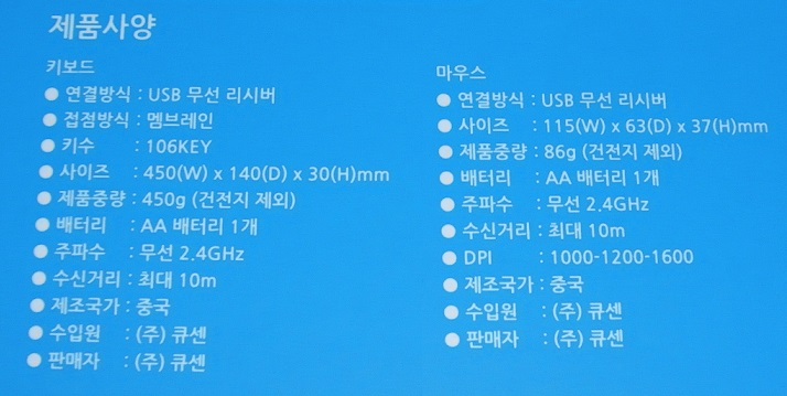 키보드, 마우스의 제품 사양입니다.