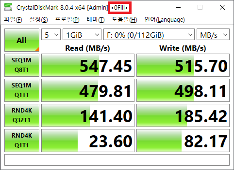 테스트 데이터 설정을 0Fill로 변경한 후 진행한 크리스탈 디스크 마크 결과입니다.