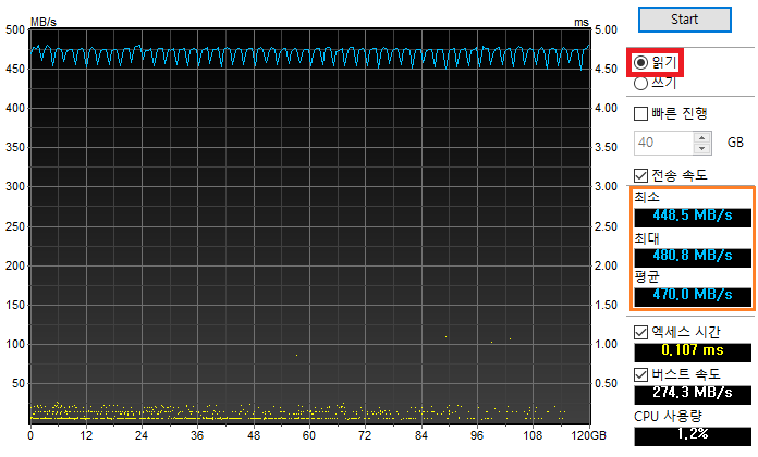 전 구간 평균 읽기 속도가 470MB/s로 측정되었습니다.