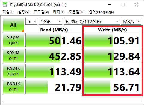 단일 순차 쓰기 속도가 공식 표기 속도보다 많이 낮은 129MB/s로 측정이 되었습니다.