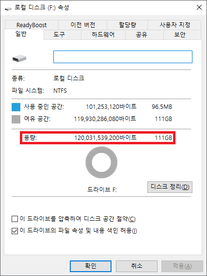 표기 용량은 120GB이지만 실사용 가능 용량은 약 111GB입니다.