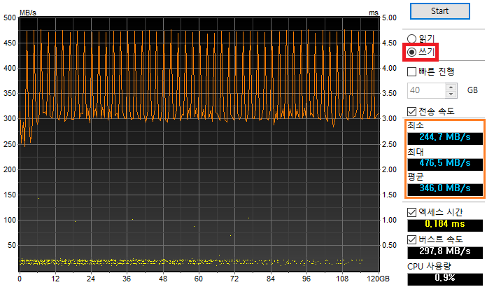 실제 쓰기 속도는 위 결과처럼 높지 않습니다.