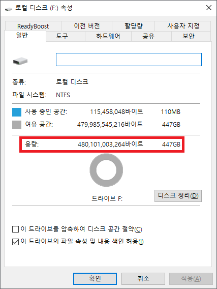 480GB SSD의 실제 사용 가능 용량은 약 447GB입니다.